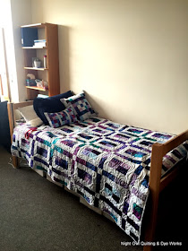 And here you see it where it will be living for the next 8 months.  City Slicker is the perfect sized quilt for a standard dorm room bed.  This one is a twin XL.