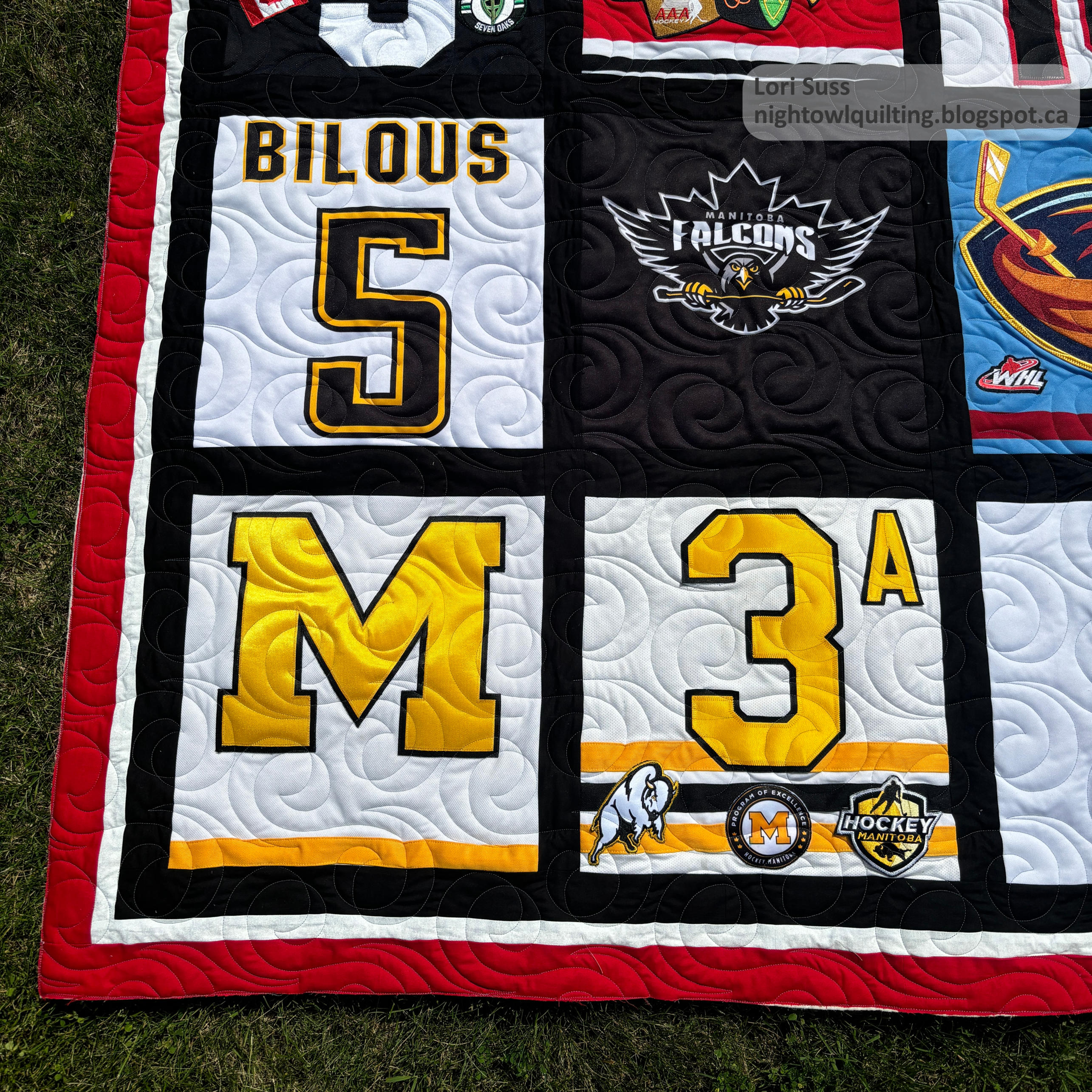 This is the second quilt that Cathy made with her grandson's hockey jerseys. You can see the first one here. This is quite a heavy quilt as it is big enough to cover my queen size bed and has a cozy plush backing as well.
